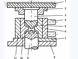 1.上模板?2.凸模固定板?3.凸 模?4.導 柱?5.右凹模?6.右凹模動模板7.墊 板?8.下模板?9.頂桿鑲塊?10.左凹模?11.左凹模定模板