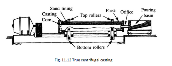 一個(gè)正規(guī)的用于在砂模中制作鑄鐵喉管的離心鑄造機(jī)如圖11.12所示。首先,砂箱里裝滿沙子以保證所鑄管子的外形。任何尾部細(xì)節(jié),如套管尾部或者法蘭尾部都是在干砂型芯的幫助下獲得。東莞CNC加工廠為了減小在鑄造過(guò)程中的不良震動(dòng),長(zhǎng)頸瓶是動(dòng)態(tài)平衡的。安裝在輥?zhàn)雍湍>咧g的已完成的長(zhǎng)頸瓶是慢慢的旋轉(zhuǎn)的。現(xiàn)在,注入的熔融金屬液決定了所鑄管子的厚度。澆鑄完成后,模具以運(yùn)轉(zhuǎn)速度繼續(xù)旋轉(zhuǎn)直到凝固,最后形成所需形狀。然后,更新機(jī)模具,繼續(xù)加工。金屬模具也可以用在離心鑄造中鑄造高質(zhì)量的產(chǎn)品。東莞CNC加工廠在模具周圍的水套 用于冷卻它。鑄造機(jī)裝上輪子并且?guī)е鴿茶T的長(zhǎng)柄勺,不斷的噴鑄延伸直到做出管子的另一端。為了讓金屬液沿著整個(gè)管子的長(zhǎng)度填充完全,鑄造機(jī)慢慢移動(dòng)到軌道。機(jī)器不斷的旋轉(zhuǎn)直到管子完全的凝固。隨后,從模具中取出管子,循環(huán)重復(fù)。
